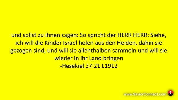 und sollst zu ihnen sagen: So spricht der HERR HERR: Siehe, ich will die Kinder Israel holen aus den Heiden, dahin sie gezogen sind, und will sie allenthalben sammeln und will sie wieder in ihr Land bringen -Hesekiel 37:21 L1912