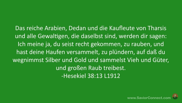 Das reiche Arabien, Dedan und die Kaufleute von Tharsis und alle Gewaltigen, die daselbst sind, werden dir sagen: Ich meine ja, du seist recht gekommen, zu rauben, und hast deine Haufen versammelt, zu plündern, auf daß du wegnimmst Silber und Gold und sammelst Vieh und Güter, und großen Raub treibest. -Hesekiel 38:13 L1912