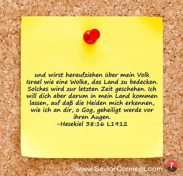 und wirst heraufziehen über mein Volk Israel wie eine Wolke, das Land zu bedecken. Solches wird zur letzten Zeit geschehen. Ich will dich aber darum in mein Land kommen lassen, auf daß die Heiden mich erkennen, wie ich an dir, o Gog, geheiligt werde vor ihren Augen. -Hesekiel 38:16 L1912