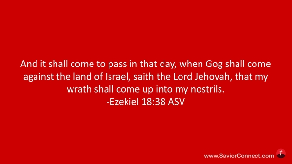 Und es wird geschehen zu der Zeit, wann Gog kommen wird über das Land Israel, spricht der HERR HERR, wird heraufziehen mein Zorn in meinem Grimm. -Hesekiel 38:18 L1912