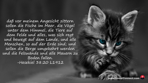 daß vor meinem Angesicht zittern sollen die Fische im Meer, die Vögel unter dem Himmel, die Tiere auf dem Felde und alles, was sich regt und bewegt auf dem Lande, und alle Menschen, so auf der Erde sind; und sollen die Berge umgekehrt werden und die Felswände und alle Mauern zu Boden fallen. -Hesekiel 38:20 L1912