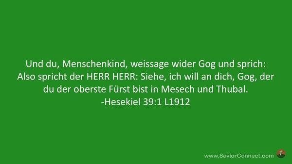 Und du, Menschenkind, weissage wider Gog und sprich: Also spricht der HERR HERR: Siehe, ich will an dich, Gog, der du der oberste Fürst bist in Mesech und Thubal. -Hesekiel 39:1 L1912