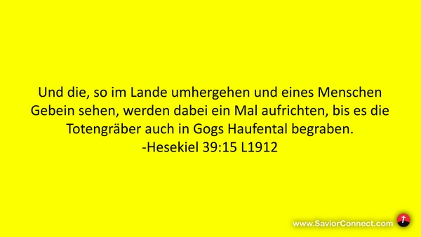Und die, so im Lande umhergehen und eines Menschen Gebein sehen, werden dabei ein Mal aufrichten, bis es die Totengräber auch in Gogs Haufental begraben. -Hesekiel 39:15 L1912