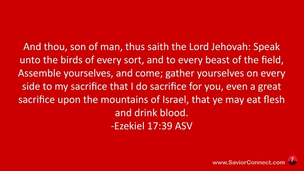 Nun, du Menschenkind, so spricht der HERR HERR: Sage allen Vögeln, woher sie fliegen, und allen Tieren auf dem Felde: Sammelt euch und kommt her, findet euch allenthalben zuhauf zu meinem Schlachtopfer, das ich euch schlachte, ein großes Schlachtopfer auf den Bergen Israels, fresset Fleisch und saufet Blut! -Hesekiel 39:17 L1912
