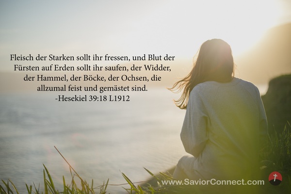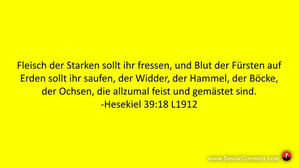 Fleisch der Starken sollt ihr fressen, und Blut der Fürsten auf Erden sollt ihr saufen, der Widder, der Hammel, der Böcke, der Ochsen, die allzumal feist und gemästet sind. -Hesekiel 39:18 L1912