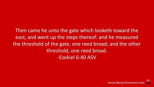 Und er ging ein zum Tor, das gegen Morgen lag, und ging hinauf auf seinen Stufen und maß die Schwelle, eine Rute breit. -Hesekiel 40:6 L1912