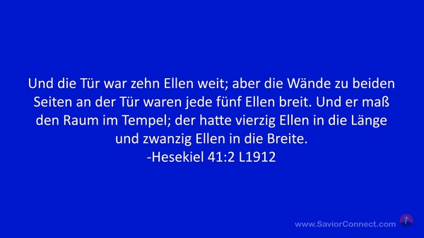 Und die Tür war zehn Ellen weit; aber die Wände zu beiden Seiten an der Tür waren jede fünf Ellen breit. Und er maß den Raum im Tempel; der hatte vierzig Ellen in die Länge und zwanzig Ellen in die Breite. -Hesekiel 41:2 L1912