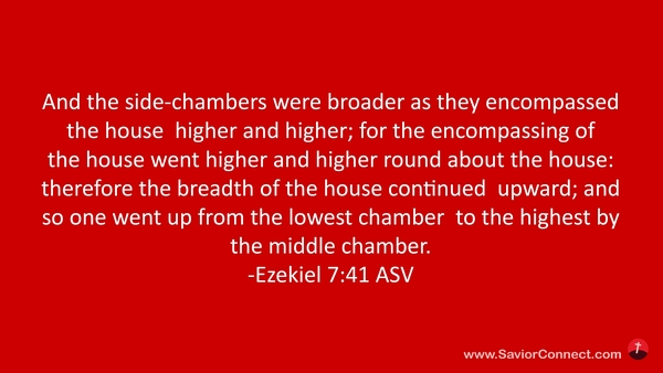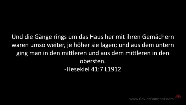 Und die Gänge rings um das Haus her mit ihren Gemächern waren umso weiter, je höher sie lagen; und aus dem untern ging man in den mittleren und aus dem mittleren in den obersten. -Hesekiel 41:7 L1912