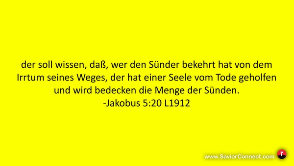 der soll wissen, daß, wer den Sünder bekehrt hat von dem Irrtum seines Weges, der hat einer Seele vom Tode geholfen und wird bedecken die Menge der Sünden. -Jakobus 5:20 L1912