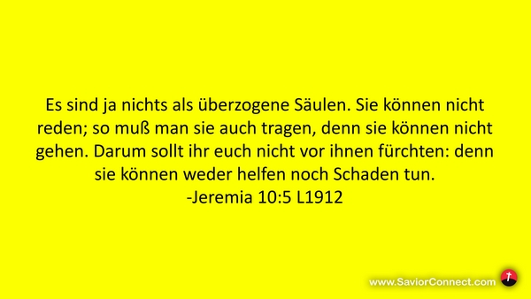 Es sind ja nichts als überzogene Säulen. Sie können nicht reden; so muß man sie auch tragen, denn sie können nicht gehen. Darum sollt ihr euch nicht vor ihnen fürchten: denn sie können weder helfen noch Schaden tun. -Jeremia 10:5 L1912