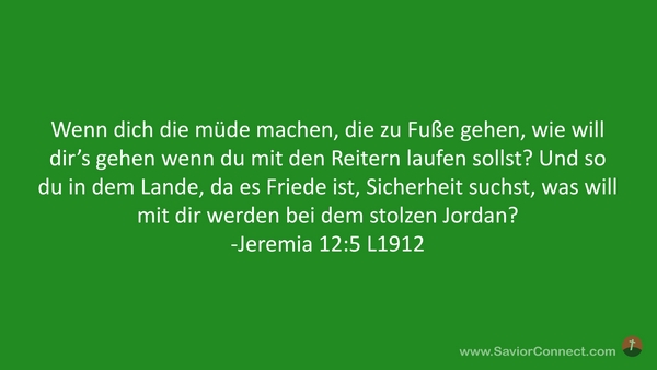 Wenn dich die müde machen, die zu Fuße gehen, wie will dir's gehen wenn du mit den Reitern laufen sollst? Und so du in dem Lande, da es Friede ist, Sicherheit suchst, was will mit dir werden bei dem stolzen Jordan? -Jeremia 12:5 L1912