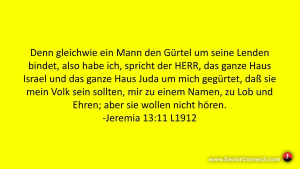 Denn gleichwie ein Mann den Gürtel um seine Lenden bindet, also habe ich, spricht der HERR, das ganze Haus Israel und das ganze Haus Juda um mich gegürtet, daß sie mein Volk sein sollten, mir zu einem Namen, zu Lob und Ehren; aber sie wollen nicht hören. -Jeremia 13:11 L1912