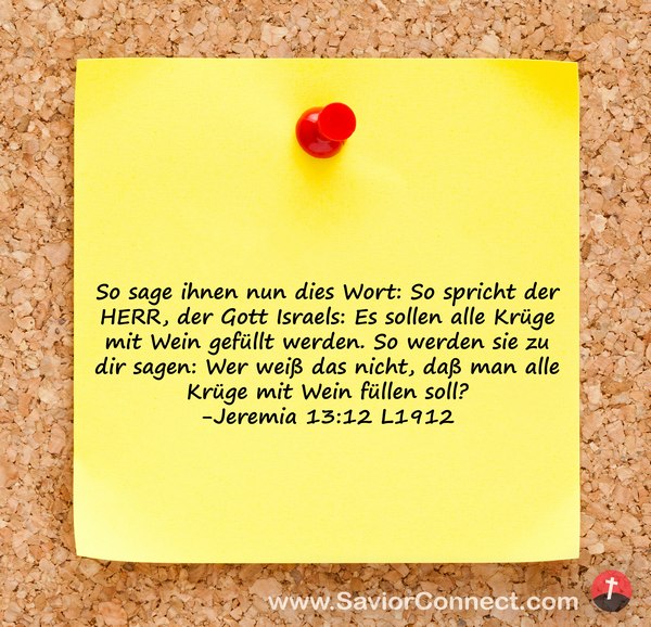So sage ihnen nun dies Wort: So spricht der HERR, der Gott Israels: Es sollen alle Krüge mit Wein gefüllt werden. So werden sie zu dir sagen: Wer weiß das nicht, daß man alle Krüge mit Wein füllen soll? -Jeremia 13:12 L1912