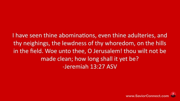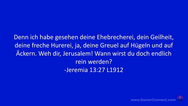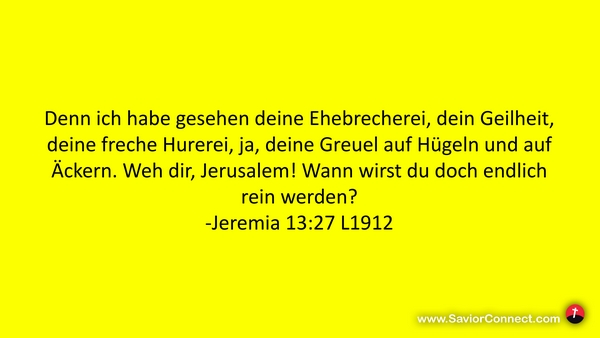 Denn ich habe gesehen deine Ehebrecherei, dein Geilheit, deine freche Hurerei, ja, deine Greuel auf Hügeln und auf Äckern. Weh dir, Jerusalem! Wann wirst du doch endlich rein werden? -Jeremia 13:27 L1912