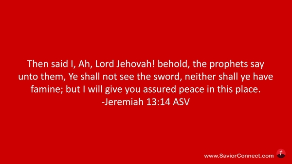 Da sprach ich: Ach HERR HERR, siehe, die Propheten sagen ihnen: Ihr werdet kein Schwert sehen und keine Teuerung bei euch haben; sondern ich will euch guten Frieden geben an diesem Ort. -Jeremia 14:13 L1912