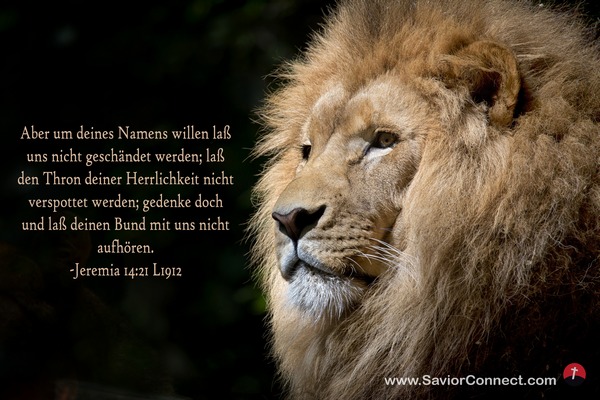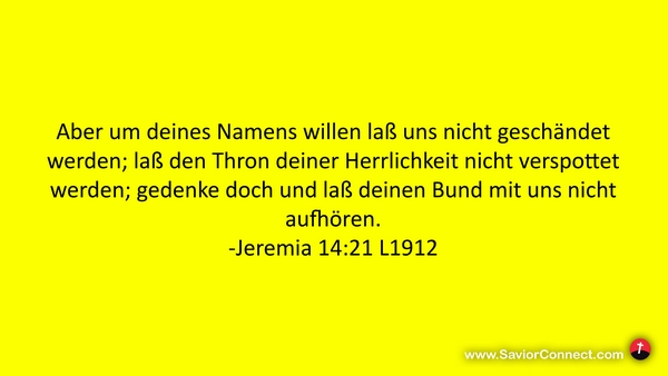 Aber um deines Namens willen laß uns nicht geschändet werden; laß den Thron deiner Herrlichkeit nicht verspottet werden; gedenke doch und laß deinen Bund mit uns nicht aufhören. -Jeremia 14:21 L1912