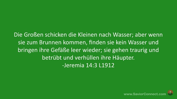 Die Großen schicken die Kleinen nach Wasser; aber wenn sie zum Brunnen kommen, finden sie kein Wasser und bringen ihre Gefäße leer wieder; sie gehen traurig und betrübt und verhüllen ihre Häupter. -Jeremia 14:3 L1912