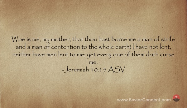 Ach, meine Mutter, daß du mich geboren hast, wider den jedermann hadert und zankt im ganzen Lande! Habe ich doch weder auf Wucher geliehen noch genommen; doch flucht mir jedermann. -Jeremia 15:10 L1912