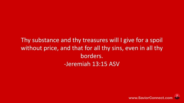 Ich will aber zuvor euer Gut und eure Schätze zum Raub geben, daß ihr nichts dafür kriegen sollt, und das um aller eurer Sünden willen, die ihr in allen euren Grenzen begangen habt. -Jeremia 15:13 L1912