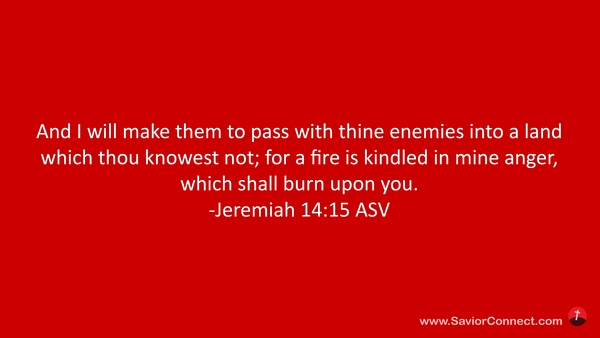 Und ich will euch zu euren Feinden bringen in ein Land, das ihr nicht kennt; denn es ist das Feuer in meinem Zorn über euch angegangen. -Jeremia 15:14 L1912