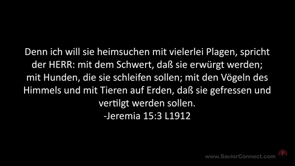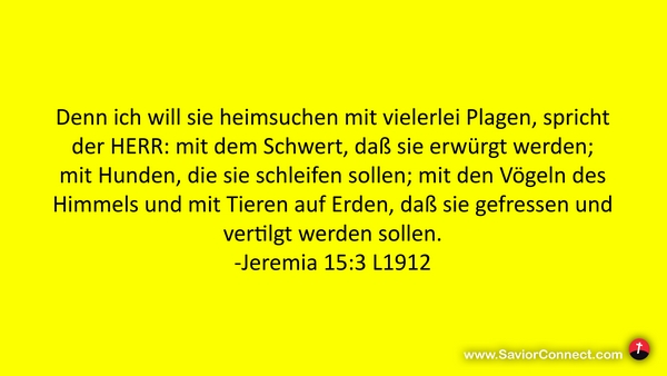 Denn ich will sie heimsuchen mit vielerlei Plagen, spricht der HERR: mit dem Schwert, daß sie erwürgt werden; mit Hunden, die sie schleifen sollen; mit den Vögeln des Himmels und mit Tieren auf Erden, daß sie gefressen und vertilgt werden sollen. -Jeremia 15:3 L1912