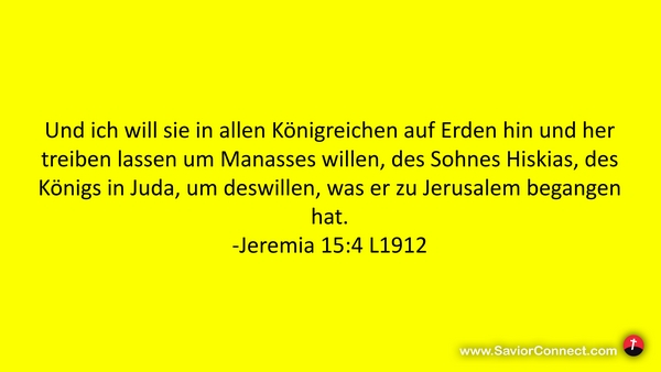Und ich will sie in allen Königreichen auf Erden hin und her treiben lassen um Manasses willen, des Sohnes Hiskias, des Königs in Juda, um deswillen, was er zu Jerusalem begangen hat. -Jeremia 15:4 L1912