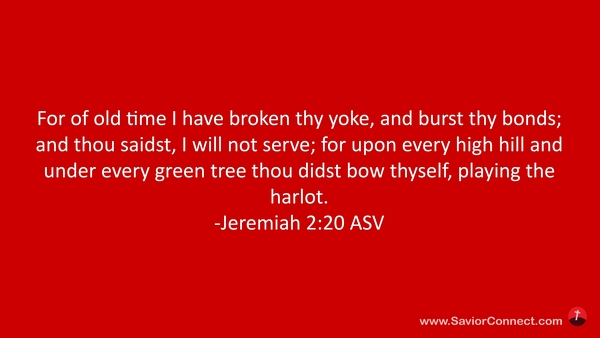Denn du hast immerdar dein Joch zerbrochen und deine Bande zerrissen und gesagt: Ich will nicht unterworfen sein! sondern auf allen hohen Hügeln und unter allen grünen Bäumen liefst du den Götzen nach. -Jeremia 2:20 L1912