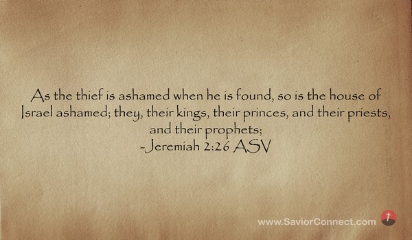 Wie ein Dieb zu Schanden wird, wenn er ergriffen wird, also wird das Haus Israel zu Schanden werden samt ihren Königen, Fürsten, Priestern und Propheten, -Jeremia 2:26 L1912