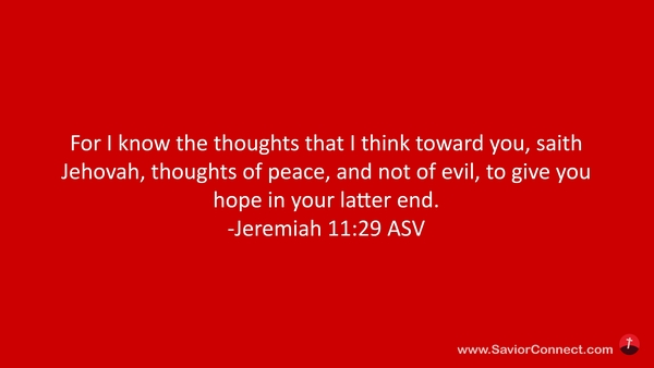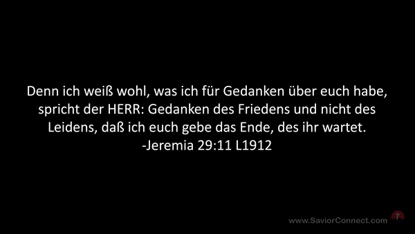 Denn ich weiß wohl, was ich für Gedanken über euch habe, spricht der HERR: Gedanken des Friedens und nicht des Leidens, daß ich euch gebe das Ende, des ihr wartet. -Jeremia 29:11 L1912