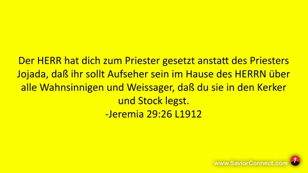 Der HERR hat dich zum Priester gesetzt anstatt des Priesters Jojada, daß ihr sollt Aufseher sein im Hause des HERRN über alle Wahnsinnigen und Weissager, daß du sie in den Kerker und Stock legst. -Jeremia 29:26 L1912