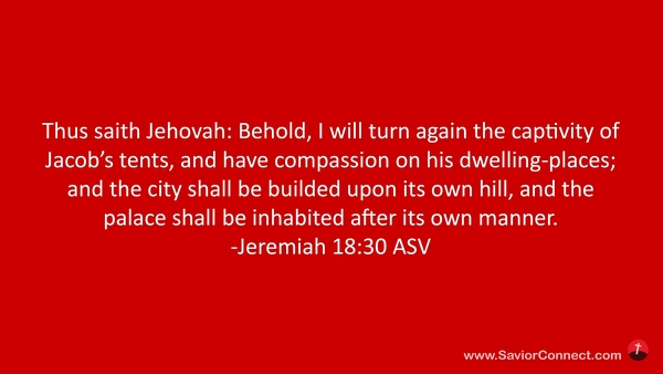So spricht der HERR: Siehe, ich will das Gefängnis der Hütten Jakobs wenden und mich über seine Wohnungen erbarmen, und die Stadt soll wieder auf ihre Hügel gebaut werden, und der Tempel soll stehen nach seiner Weise. -Jeremia 30:18 L1912