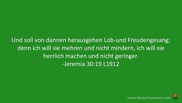 Und soll von dannen herausgehen Lob-und Freudengesang; denn ich will sie mehren und nicht mindern, ich will sie herrlich machen und nicht geringer. -Jeremia 30:19 L1912
