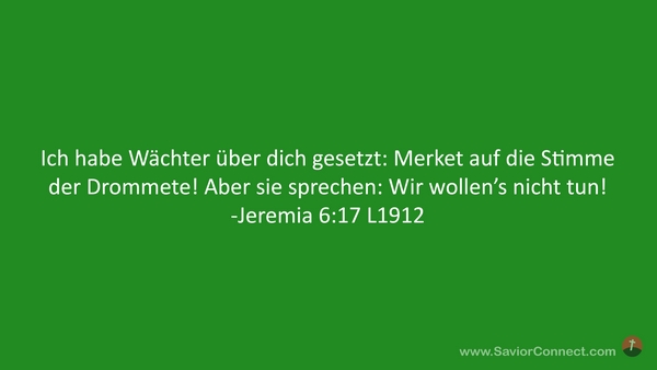 Ich habe Wächter über dich gesetzt: Merket auf die Stimme der Drommete! Aber sie sprechen: Wir wollen's nicht tun! -Jeremia 6:17 L1912