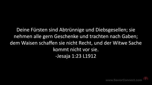 Deine Fürsten sind Abtrünnige und Diebsgesellen; sie nehmen alle gern Geschenke und trachten nach Gaben; dem Waisen schaffen sie nicht Recht, und der Witwe Sache kommt nicht vor sie. -Jesaja 1:23 L1912