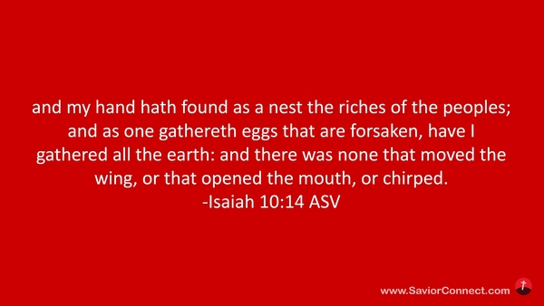 und meine Hand hat gefunden die Völker wie ein Vogelnest, daß ich habe alle Lande zusammengerafft, wie man Eier aufrafft, die verlassen sind, da keines eine Feder regt oder den Schnabel aufsperrt oder zischt. -Jesaja 10:14 L1912