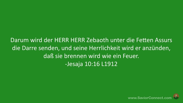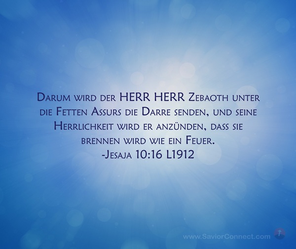 Darum wird der HERR HERR Zebaoth unter die Fetten Assurs die Darre senden, und seine Herrlichkeit wird er anzünden, daß sie brennen wird wie ein Feuer. -Jesaja 10:16 L1912