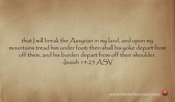 daß Assur zerschlagen werde in meinem Lande und ich ihn zertrete auf meinen Bergen, auf daß sein Joch von ihnen genommen werde und seine Bürde von ihrem Hals komme. -Jesaja 14:25 L1912