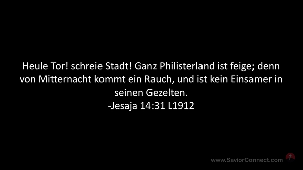 Heule Tor! schreie Stadt! Ganz Philisterland ist feige; denn von Mitternacht kommt ein Rauch, und ist kein Einsamer in seinen Gezelten. -Jesaja 14:31 L1912