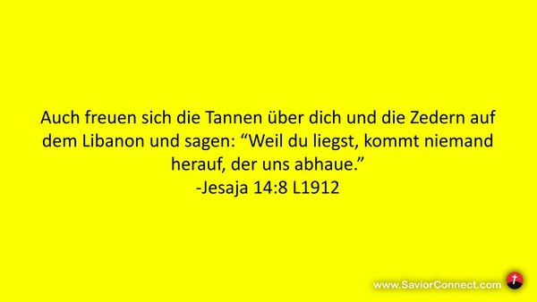 Auch freuen sich die Tannen über dich und die Zedern auf dem Libanon und sagen: “Weil du liegst, kommt niemand herauf, der uns abhaue.” -Jesaja 14:8 L1912