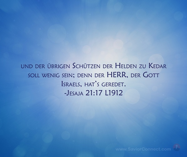 und der übrigen Schützen der Helden zu Kedar soll wenig sein; denn der HERR, der Gott Israels, hat's geredet. -Jesaja 21:17 L1912