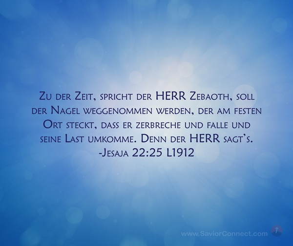 Zu der Zeit, spricht der HERR Zebaoth, soll der Nagel weggenommen werden, der am festen Ort steckt, daß er zerbreche und falle und seine Last umkomme. Denn der HERR sagt's. -Jesaja 22:25 L1912