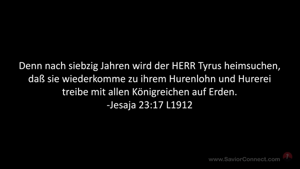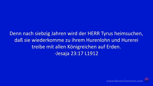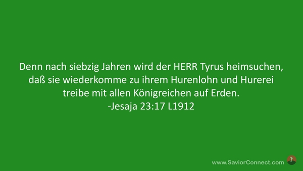 Denn nach siebzig Jahren wird der HERR Tyrus heimsuchen, daß sie wiederkomme zu ihrem Hurenlohn und Hurerei treibe mit allen Königreichen auf Erden. -Jesaja 23:17 L1912