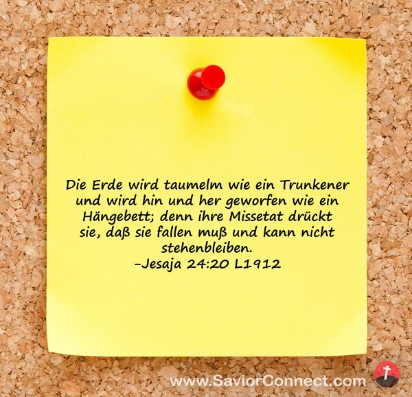 Die Erde wird taumelm wie ein Trunkener und wird hin und her geworfen wie ein Hängebett; denn ihre Missetat drückt sie, daß sie fallen muß und kann nicht stehenbleiben. -Jesaja 24:20 L1912