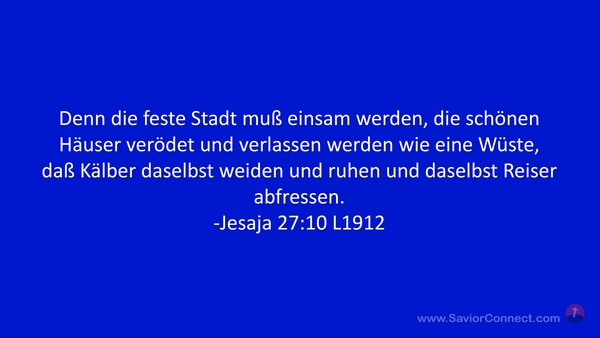 Denn die feste Stadt muß einsam werden, die schönen Häuser verödet und verlassen werden wie eine Wüste, daß Kälber daselbst weiden und ruhen und daselbst Reiser abfressen. -Jesaja 27:10 L1912