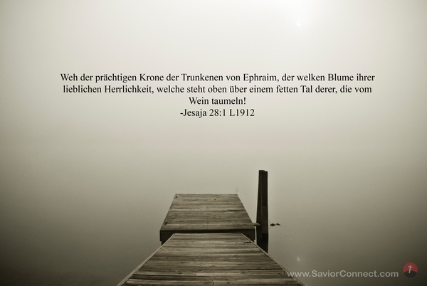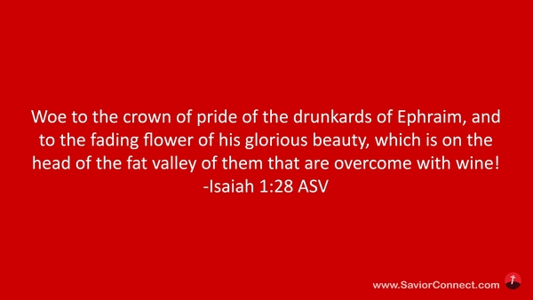 Weh der prächtigen Krone der Trunkenen von Ephraim, der welken Blume ihrer lieblichen Herrlichkeit, welche steht oben über einem fetten Tal derer, die vom Wein taumeln! -Jesaja 28:1 L1912