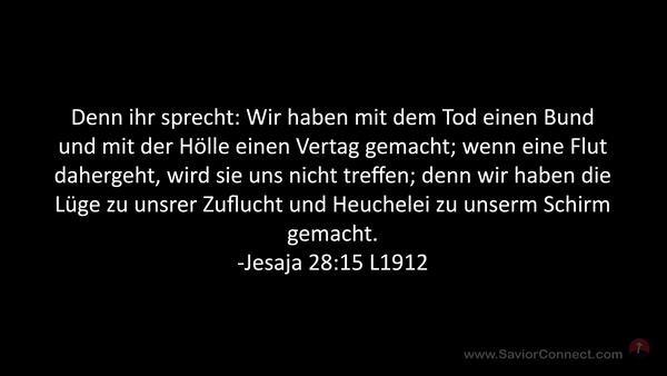 Denn ihr sprecht: Wir haben mit dem Tod einen Bund und mit der Hölle einen Vertag gemacht; wenn eine Flut dahergeht, wird sie uns nicht treffen; denn wir haben die Lüge zu unsrer Zuflucht und Heuchelei zu unserm Schirm gemacht. -Jesaja 28:15 L1912