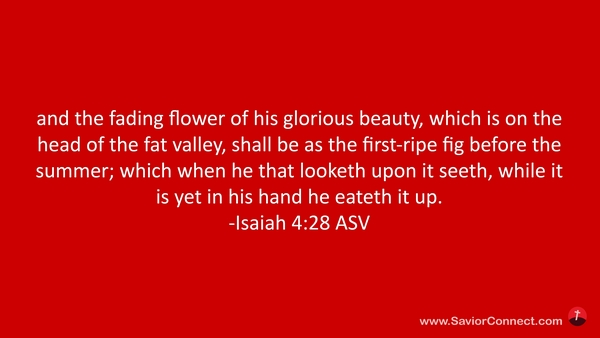 Und die welke Blume ihrer lieblichen Herrlichkeit, welche steht oben über einem fetten Tal, wird sein gleichwie die Frühfeige vor dem Sommer, welche einer ersieht und flugs aus der Hand verschlingt. -Jesaja 28:4 L1912