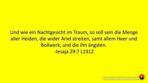 Und wie ein Nachtgesicht im Traum, so soll sein die Menge aller Heiden, die wider Ariel streiten, samt allem Heer und Bollwerk, und die ihn ängsten. -Jesaja 29:7 L1912