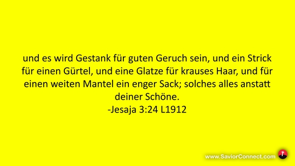 und es wird Gestank für guten Geruch sein, und ein Strick für einen Gürtel, und eine Glatze für krauses Haar, und für einen weiten Mantel ein enger Sack; solches alles anstatt deiner Schöne. -Jesaja 3:24 L1912