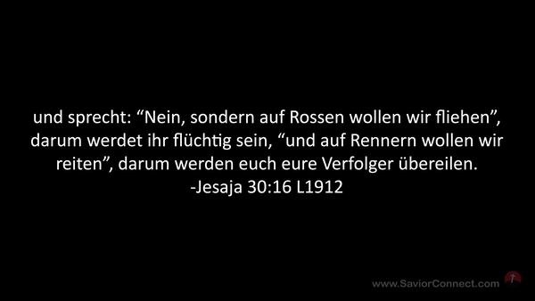 und sprecht: “Nein, sondern auf Rossen wollen wir fliehen”, darum werdet ihr flüchtig sein, “und auf Rennern wollen wir reiten”, darum werden euch eure Verfolger übereilen. -Jesaja 30:16 L1912